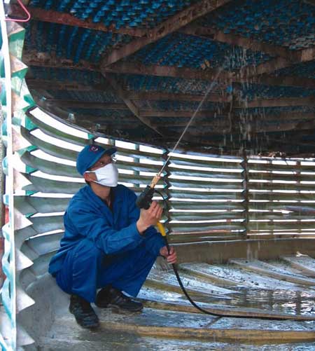 玻璃鋼廠的員工認真的清洗玻璃鋼冷卻塔